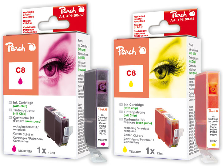 Eine weitere Möglichkeit um Druckkosten zu sparen ist es, anstatt den Originalpatronen von Canon die kompatiblen CLi-8 Tintenpatronen von Peach zu verwenden. Hierbei handelt es sich um nachgebaute Druckerpatronen, die genau wie die Originalpatronen von Canon funktionieren. Sie werden einfach in den Tintenstrahldrucker eingesetzt und schon kann man mit der Druckarbeit beginnen. Da die kompatiblen Druckerpatronen von Peach ebenfalls über einen Chip für die Füllstandsmessung verfügen, funktioniert aus Tintenfüllstandsanzeige auf der Patrone und am Drucker bzw. in der Software des Druckers (Druckertreiber) auf dem Computer (PC/Mac) ganz normal.