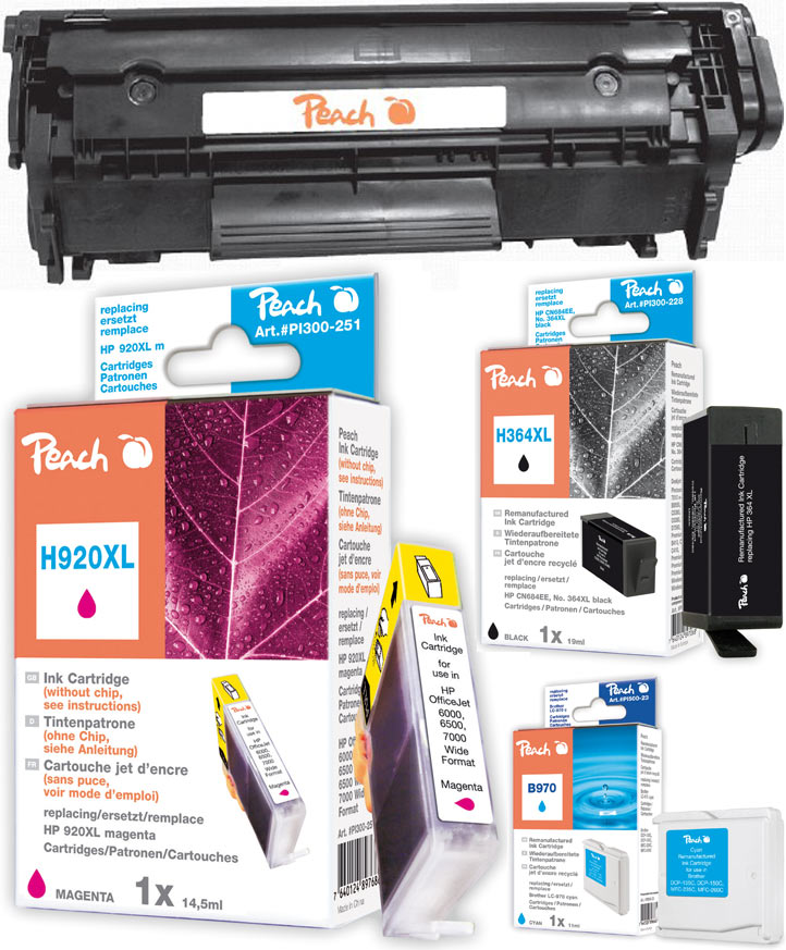 Im umfangreichen Sortiment von Peach finden Laserdrucker Besitzer eine Vielzahl von original Tonerkartuschen preisgünstig und billige Ersatz Toner. Für sämtliche Laserdrucker Modelle der führenden Druckerhersteller werden die Tonermodule günstig angeboten, z.B. für Printer von HP (Hewlett-Packard), Samsung, Brother, Canon, Epson, Apple, Lexmark, Oki oder Kyocera. Natürlich sind alle Tonerkassetten in schwarz, blau/cyan, rot/magenta und gelb vorrätig, ebenso das oft genutzte vier Farben Rainbow Kit günstig. Ohne Frage enthalten die Ersatz Toner von Peach mindestens die gleiche Füllmenge an Tonerpulver wie vergleichbare teure original Toner aus den Strassengeschäften. Trotz der Tiefpreise für Generika Toner dieses Alternativproduzenten sind keine Qualitätseinbussen zu befürchten, es wird perfekte Druckqualität erbracht. Billige Ersatz Toner und
